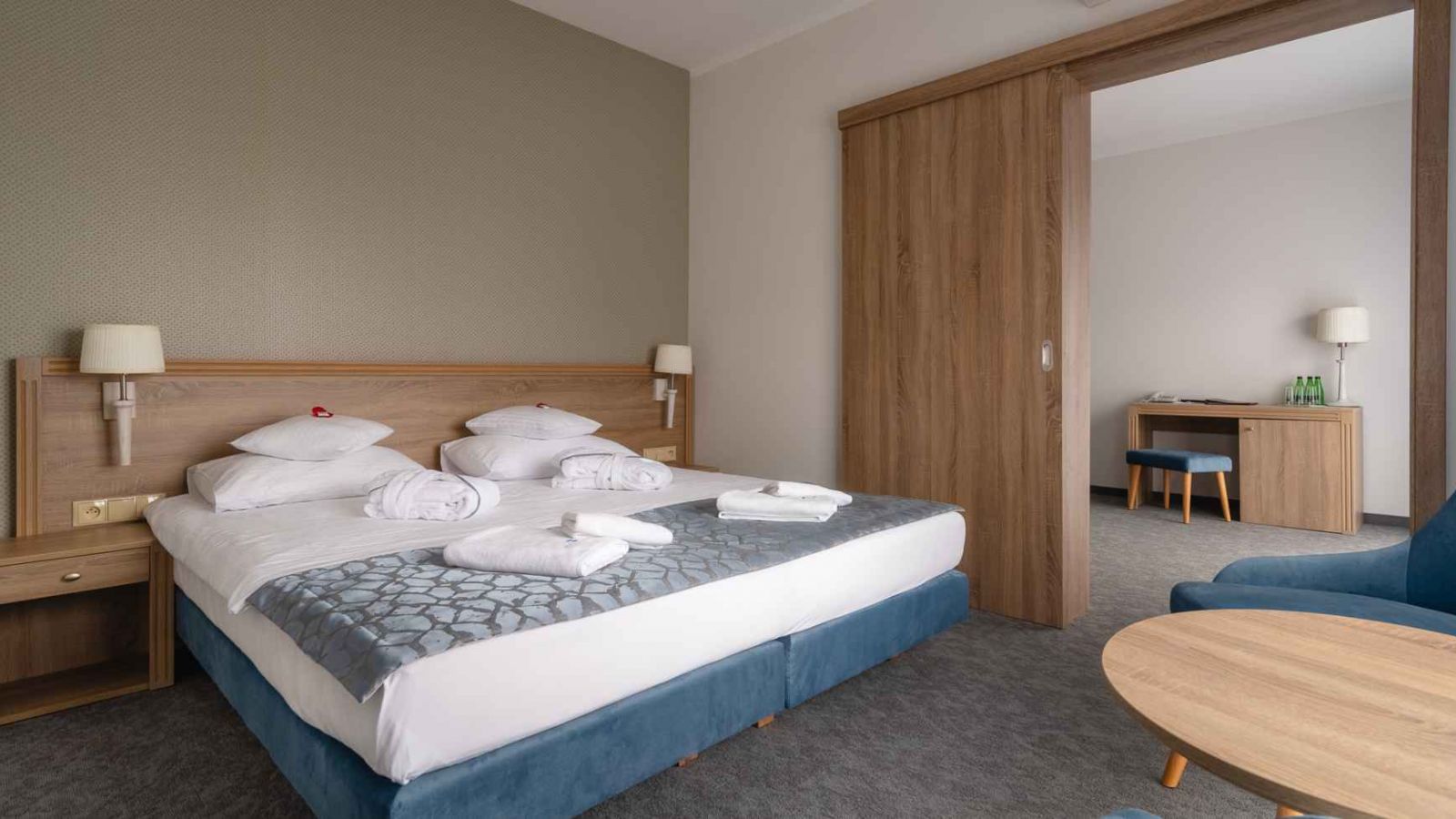 Pokój Suite Comfort jest idealny dla rodzin z dziećmi, dwa pomieszczenia: salon z sofą (lub sypialnia z łożem) oraz sypialnia z łazienką. Opłata klimatyczna 2,5 zł za dobę - nie jest wliczona do rachunku.